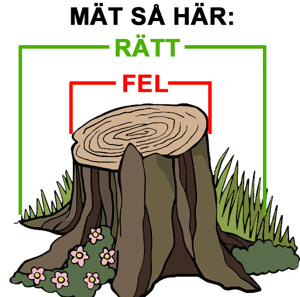 Stubben bredd mätes där stubben träffar marknivå. (se bild).
