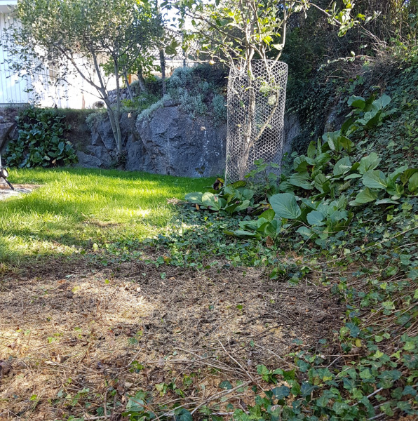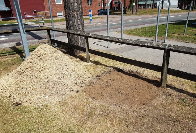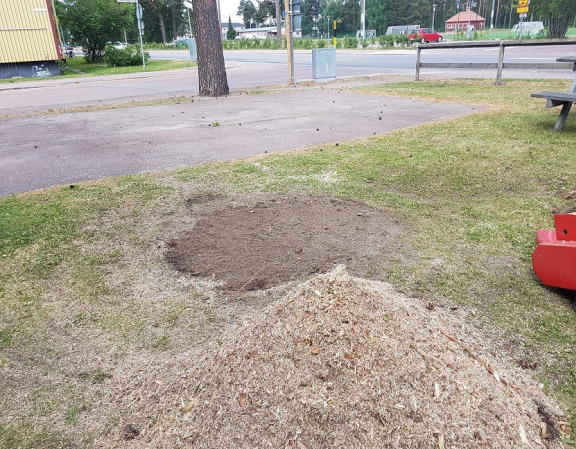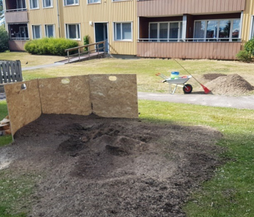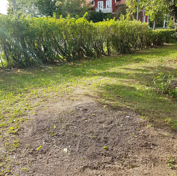 Kund tar i detta fall själv hand om spån/fliset samt kompletterar med jord och sår gräs.
