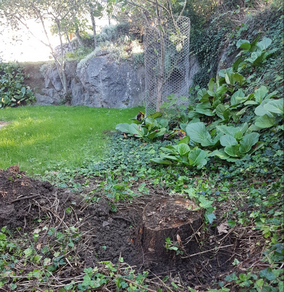 Efter att ett antal träd behövdes tas bort på grund av omdränering av huset önskade kunden få bort stubbarna innan ny gräsmatta skall anläggas.
